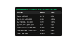 Per Young Platform Pro, abbiamo rivoluzionato il nostro modello di commissioni, passando da una struttura fissa (0.2%) a una completamente variabile per operazioni maker e taker. Questa innovazione è pensata per incontrare le esigenze dei trader avanzati, offrendo condizioni più favorevoli per chi opera con volumi significativi.