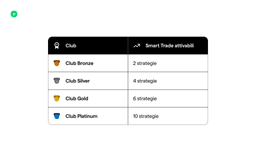 Gli Smart Trade saranno soggetti a una commissione fissa dello 0,2% sull’importo della transazione. Inoltre, si specifica che non verranno applicati sconti sulle commissioni agli Smart Trade, sia quelli previsti dalla sottoscrizione del Club, sia eventuali bonus acquisiti.